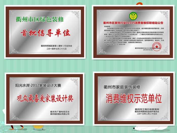 2011-2016年被衢州晚報評為十家最值得信賴的裝飾企業(yè);2016年被市場監(jiān)督管理局評為衢州市誠信裝飾企業(yè);
